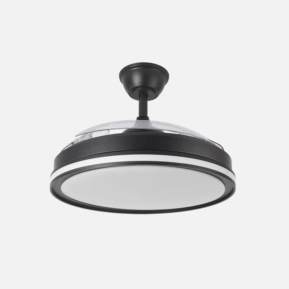 Ventilador DC de la serie CACIQUE realizado en metal, policarbonato y ABS, en color NEGRO con tres aspas DESPLEGABLES de ABS transparente muy resistentes.